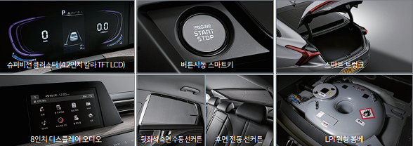 버튼 시동 스마트키, 스마트 트렁크, 뒷좌석 수동 선커튼 등의 기능을 통해서 탑승객들에게 편의를 제공하고 있습니다.