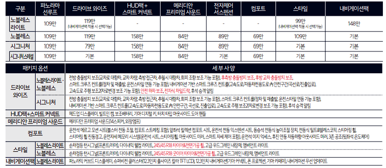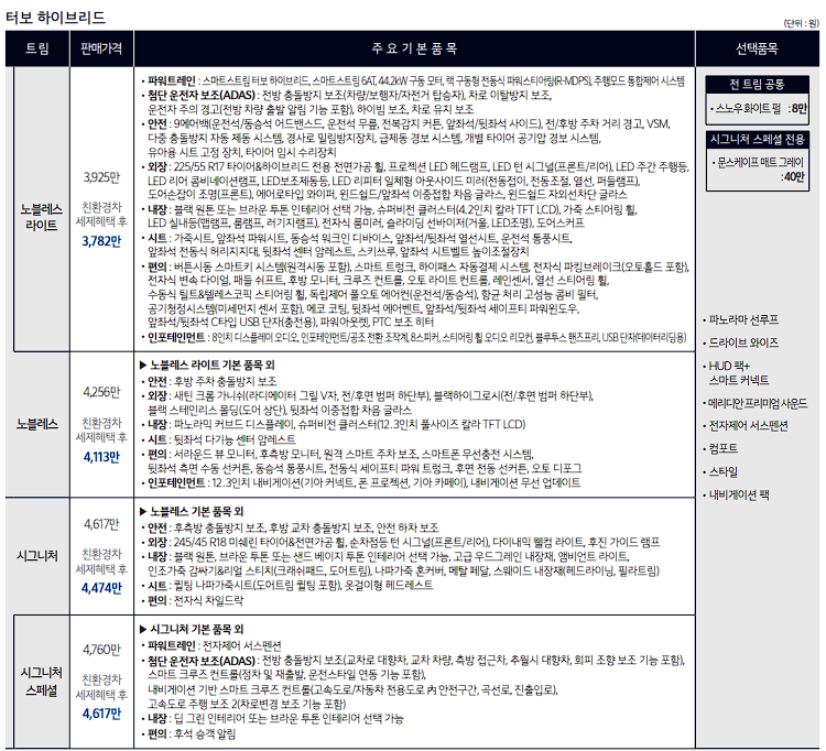 k8 하이브리드 판매 모델은 노블레스 라이트, 노블레스, 시그니처, 시그니처 스페셜로 구분됩니다.