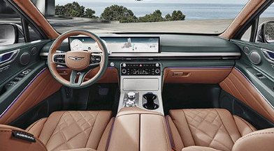 gv70 실내 디자인 중 가장 큰 변화점은 모니터와 계기판이 이어진 파노라믹 디스플레이가 적용됩니다.