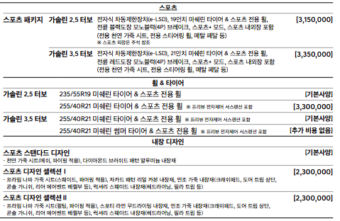 또한, 18인치 휠이 기본이며 19인치 휠을 선택하게 되면 110만원의 옵션비용이 추가됩니다. 21인치 휠은 330만원의 옵션비용이 발생합니다.