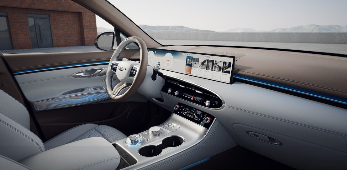 내부 디장니은 변화 폭이 큽니다. 실내 센터페시아 모니터가 계기판과 이어진 통합형 디스플레이가 적용됩니다. 27인치의 대화면으로 최근 출시 차들의 유행을 그대로 탑재하였습니다.