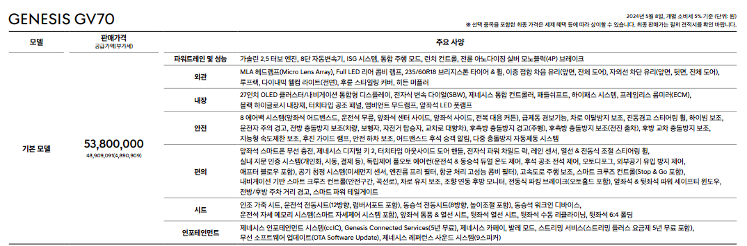 gv70 가솔린 2.5 터보 기본 가격 53,800,000원