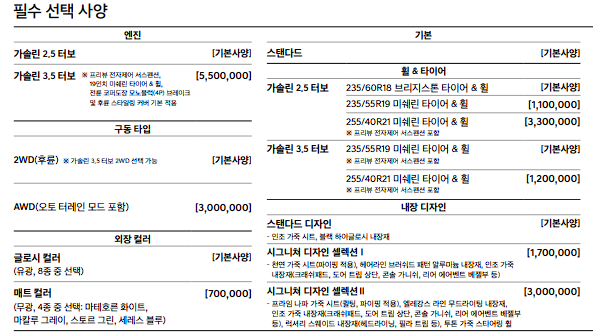 또한, 18인치 휠이 기본이며 19인치 휠을 선택하게 되면 110만원의 옵션비용이 추가됩니다. 21인치 휠은 330만원의 옵션비용이 발생합니다.