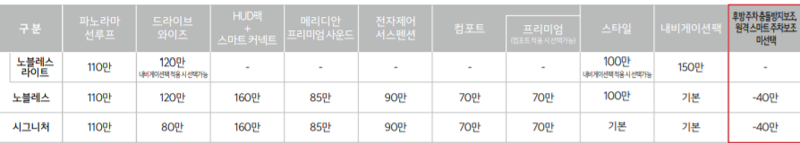 ▶ 노블레스 라이트 기본 품목 외 ■안전 : 후방 주차 충돌방지 보조 ■ 외장 : 새틴 크롬 가니쉬 (라디에이터 그릴 V자, 전/후면 범퍼 하단부), 블랙하이그로시 (전/후면 범퍼 하단부), 다크 스테인리스 몰딩(도어 상단) ■ 내장 : 파노라믹 커브드 디스플레이, 슈퍼비전 클러스터(12.3인치 풀사이즈 칼라 TFT LCD) ■편의 : 서라운드뷰 모니터, 후측방 모니터, 원격 스마트 주차 보조, 스마트폰 무선충전 시스템, 뒷좌석 측면 수동 선커튼, 동승석 통풍시트 ■인포테인먼트 : 12.3인치 UVO 내비게이션, 내비게이션 무선 업데이트 |