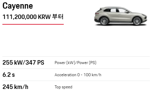포르쉐 카이엔 가장 기본 모델은 111,200,000원으로 가격이 책정되었습니다.