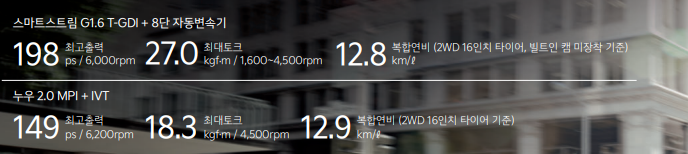 신형 셀토스의 가장 큰 변화는 2.0 가솔린 엔진이 추가된 부분입니다. 기존의 1.6 가솔린 터보 엔진에 추가된 엔진 사양으로 2.0 가솔린 사양은 149마력과 12.9km/l의 연비를 보여줍니다.