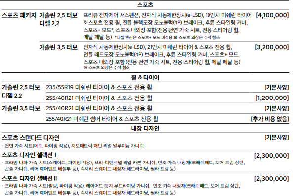 스포츠 패키지를 판매하며 프리뷰 전자제어 서스펜션, 전동식 차동 제한장치, 19인치 미쉐린 타이어, 21인치 미쉐린 타이어 등을 옵션으로 선택할 수 있습니다.